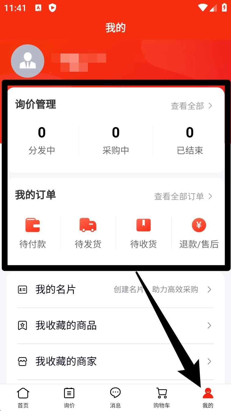 3. 登录成功后点击底部导航栏「我的」,可查看订单状态、收藏商品与采购记录等内容。