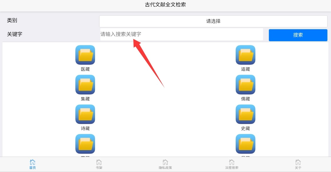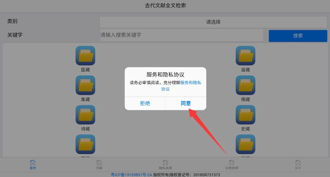 1、启动古代文献检索软件后,仔细阅读并勾选同意用户协议与隐私条款,点击确认进入主界面。