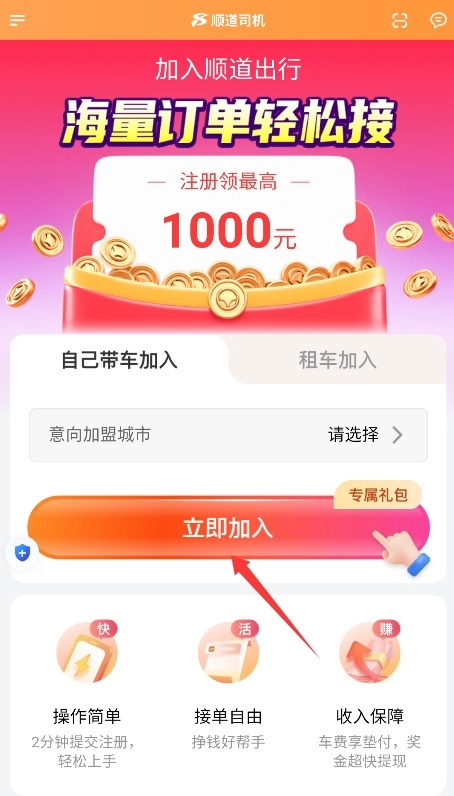 3、根据实际情况选择自带车辆或租车模式,选定城市后提交个人资料完成司机认证。