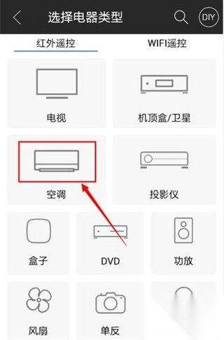 1) 打开添加遥控器,选择家电类型:空调;空调品牌:美的;