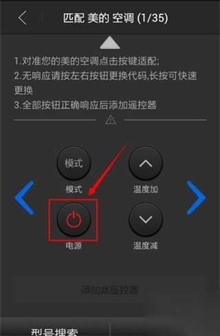 打开添加遥控器,依次点选家电型号、品牌,再对遥控按键逐个匹配,成功后即可添加此款家电的遥控器,下面以美的空调为例进行说明。