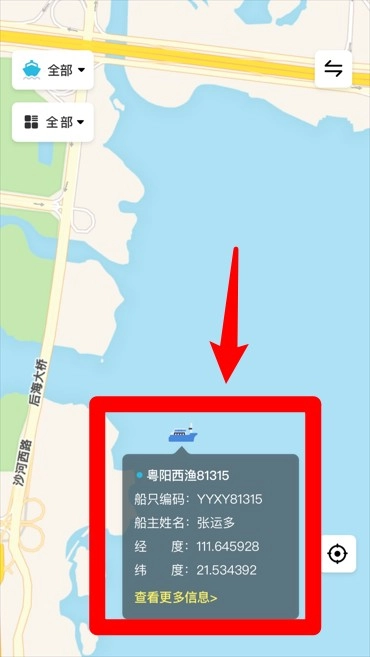 3、在地图页面,船只的位置及详细信息会实时呈现,点击后能够查看诸如船只编号、经纬度以及船主姓名等关键数据。