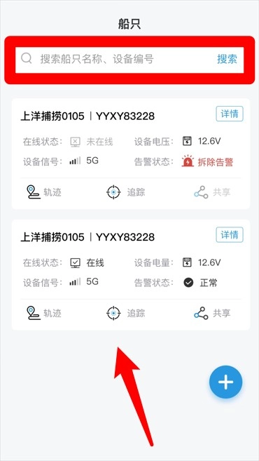 4、在船只列表页面,用户能够依据名称或者编号进行搜索,而且点击追踪按钮后,即可实时查看船只的轨迹以及状态信息。