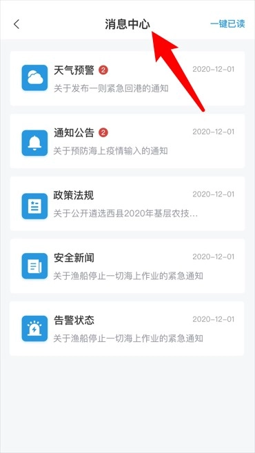5、消息中心会对天气预警、公告通知以及政策法规等各类信息进行集中推送,助力用户及时了解海上动态。