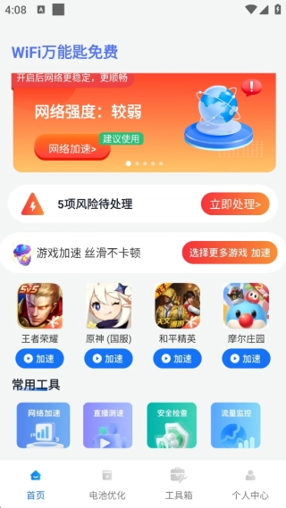 1. 在软件首页,各项功能一目了然。其核心功能包括网络加速、网络安全监测以及流量监控等。此外,软件还具备游戏提速功能,对于热衷于游戏的用户而言,实用性颇佳。