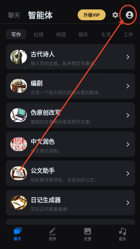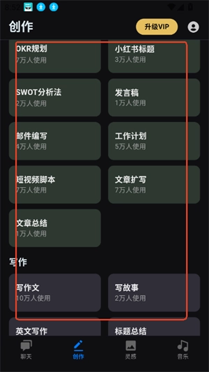4、向下滑动还可以看到工作,写作方面文本内容创作功能