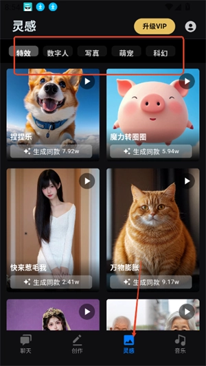 5、灵感板块具备生成图片、视频等内容的功能,并且能够选择创作风格。