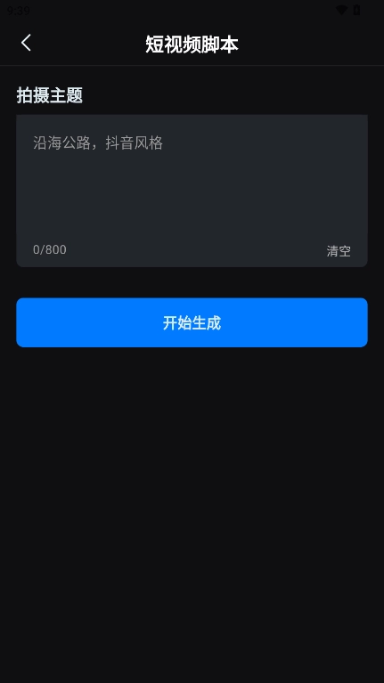 4、在文本框中输入大致的灵感拍摄主题等信息,点击“一键生成”,即可立即为您加载相关脚本内容。