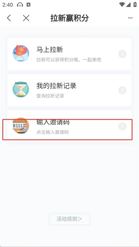 5、新用户完成注册并登录后,在首页找到banner位的活动宣传入口并点击,接着点击“输入邀请码”选项,然后把获取到的邀请码填写到该页面的空格内。