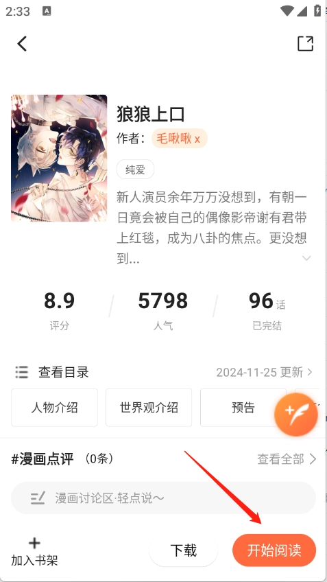 4. 用户点击想要观看的漫画,进入详情页面后,点击“开始阅读”。