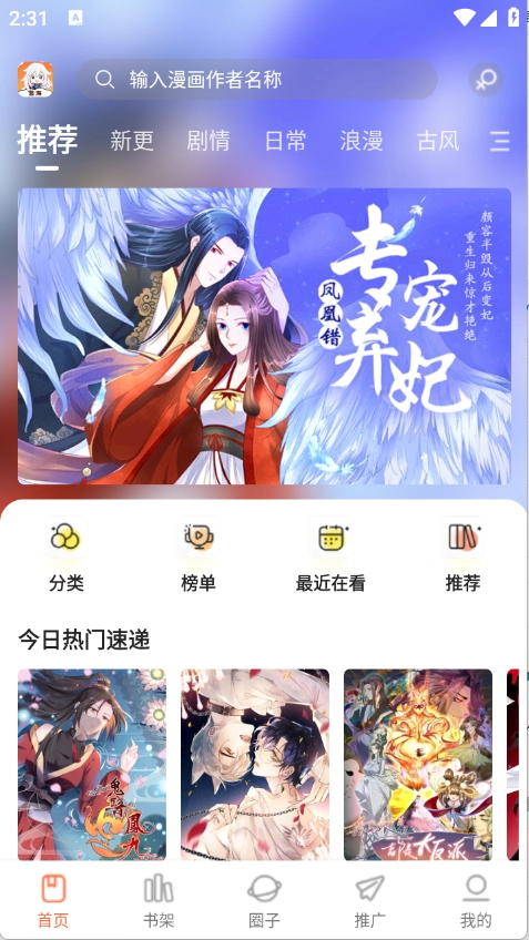 2. 漫画类型丰富多样,言情、穿越、悬疑等各类题材一应俱全。