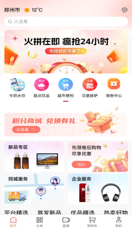 1、首页设有牛奶水饮、甜点饮品、超市便利、汉堡披萨以及领券中心等分类,还具备新品专区、同城服务和企业服务等功能。