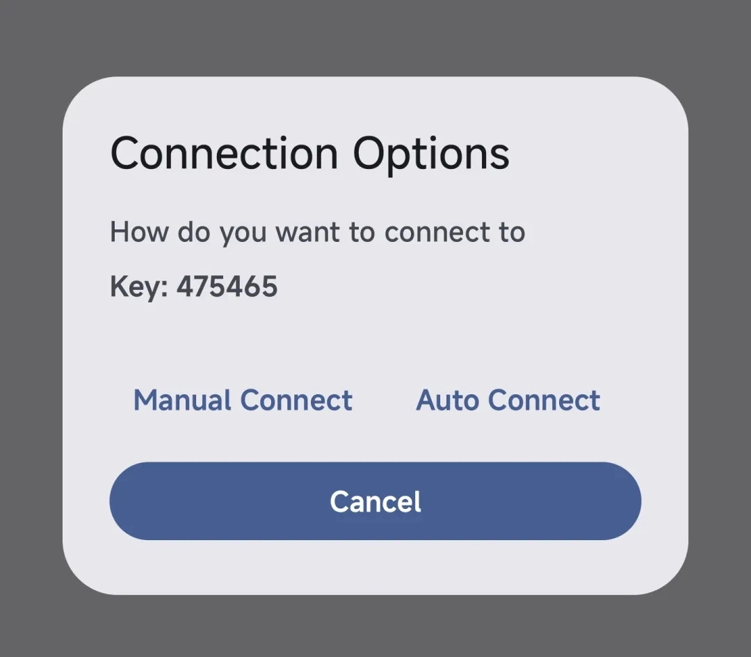 ● 使用手动连接或自动连接在Android设备上启动连接。手动连接更快,而自动连接则需要更多时间来确定哪些IP地址适用于您。