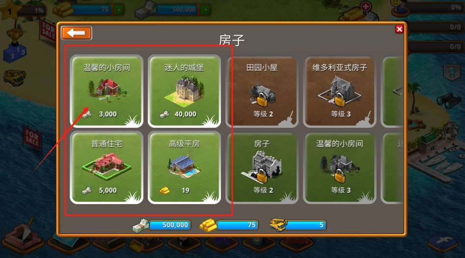 3、选红框里的温馨小房间,花3000金币买下第一栋房子。