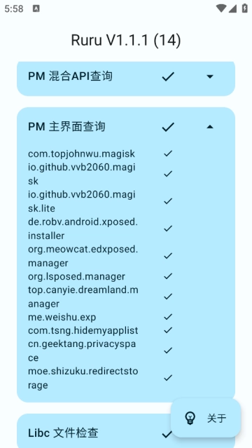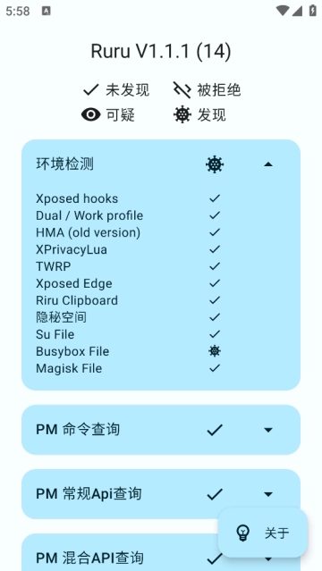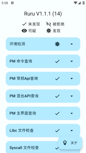 ruru环境检测最新版,这是一款手机检测类软件,而且是开源的哦。它能够满足用户对环境配置进行检测与测试的需求,帮助用户更清晰地知晓自己手机的状况。这款软件内存占用极小,甚至比一个小游戏还小,却能让你深入了解自己的手机。快来体验一下吧!