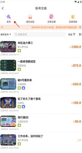 2、随后,于交易页面里选取上方的“卖号”功能。