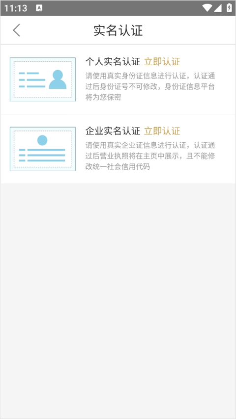 3、在此存在两个认证需求,其一为个人实名认证,其二为企业实名认证,用户可依据自身需求加以选择。