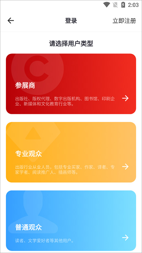1、用户先在本站获取bibf云书展应用并安装到手机上。接着打开bibf云书展进行注册登录,注册登录时有三种方式可供选择,其一为参展商(涵盖出版社、版权代理机构、图书馆、印刷企业等),其二是专业观众(即出版社行业的从业人员,包含专业买家、作家、译者、专家学者等),其三是普通观众,此处以普通观众的方式来完成注册登录。