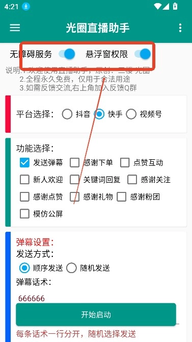 不仅如此,光圈直播助手还支持自定义机器人设置,使得整个直播过程既充满智能化,又不失人性化。1. 打开光圈直播助手,第一步在主界面选择所需的直播平台,并且开启悬浮窗权限,这样才能保证功能正常运作。