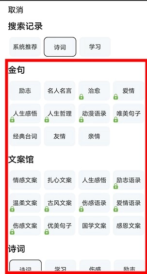 提供多种类型的句子素材,涵盖金句、名言、励志语句、情感句子、动漫影视摘录、经典语录以及诗词素材等。
