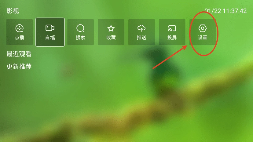 首次打开FM影视时,你会发现无法观看视频。此时,点击右上角的“设置”,位置如图所示。
