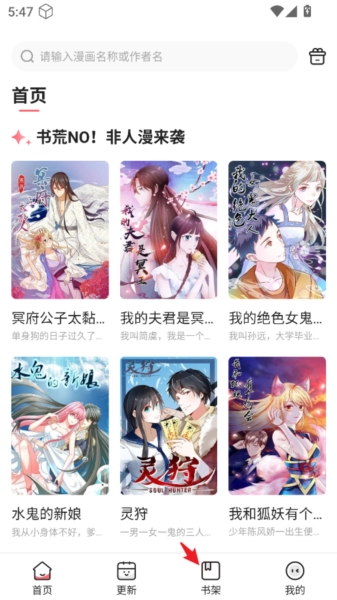 5、在首页点击下方栏目中的“书架”,就能找到已加入的漫画。
