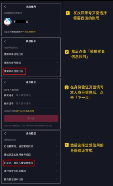 若您遗忘了已实名账号的相关信息,可通过以下方法找回账号:在抖音登录界面右上角点击「帮助」-「找回帐号」,进入找回帐号页面(若已登录,则点击「设置」-「反馈与帮助」-「帐号找回」),接着点击「使用实名信息找回」,通过申诉来找回已实名账号。