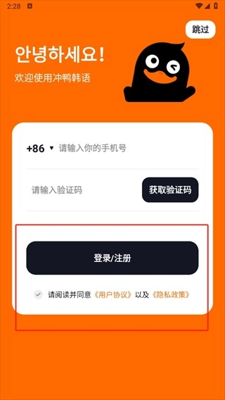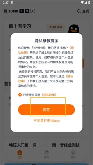 1. 第一步,进入冲鸭韩语,点击【同意】以确认用户隐私条款。