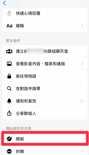 向下拉动,选中「限制」这一功能,进而确认对对方进行限制操作。