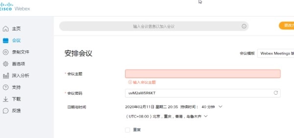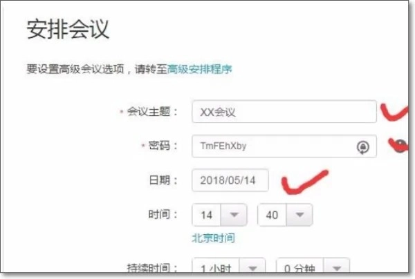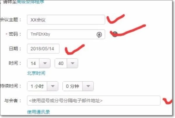 5、依次输入安排会议的主题、密码、会议日期、时间、会议时长,以及与会者邮箱。