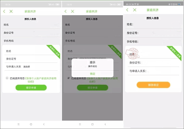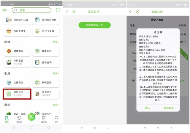 3、开通电子社保卡后,需要您返回“首页”,在“首页”中“社保模块”下点击“家庭共济”图标,然后点击“新增授权人员”,仔细阅读授权协议了解相关注意事项,并核对界面上方绑定的授权人信息;