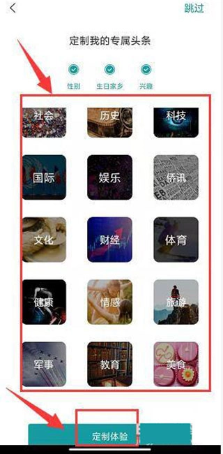 6、在兴趣板块,选择自己感兴趣的标签,然后单击定制体验选项。