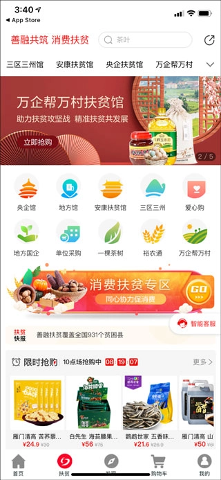 3、扶贫工作涉及多种工具与大量限时抢购商品,工具包括央企馆、地方馆、安康扶贫馆、三区三州、爱心购、地方国企、单位采购、一棵茶树、裕农通、万企帮万村等。