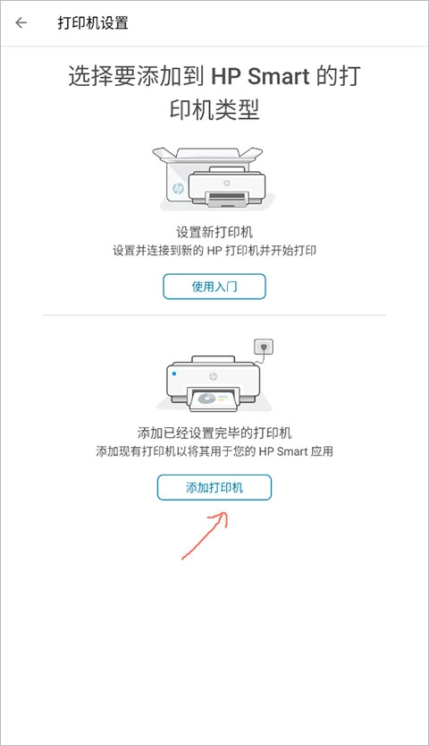8、开启HP Smart应用程序,添加打印机,接着依照提示完成打印机设置。