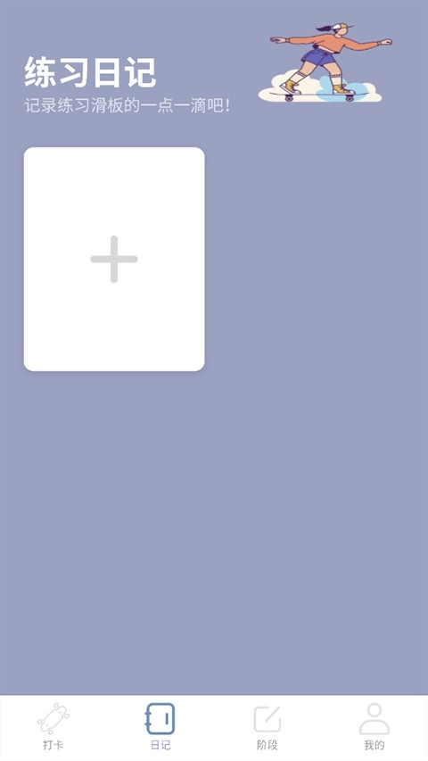 3、在【日记】页面,点击“+”,记录练习滑板过程中的点点滴滴。