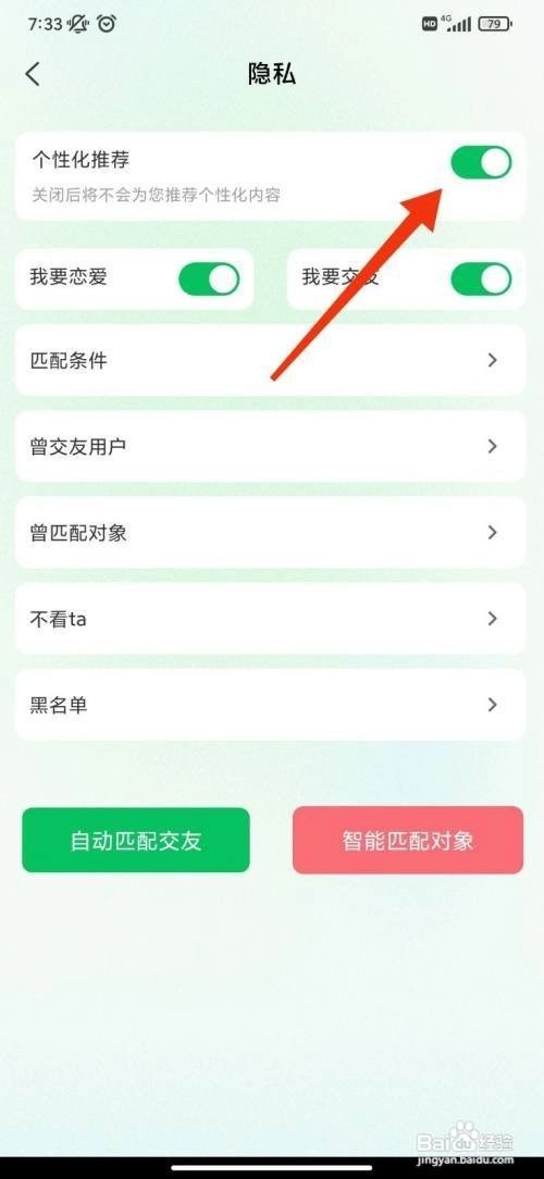第三步:在隐私页面,把【个性化返独推荐】开启即可,如图所示。