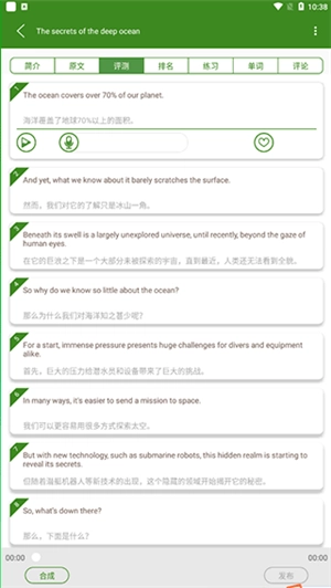 3、听完熟练的文章后,你能够选择评测功能,合成属于自己的英语语音,即自己读给自己听,如此一来,便能很好地发现自身的发音问题。