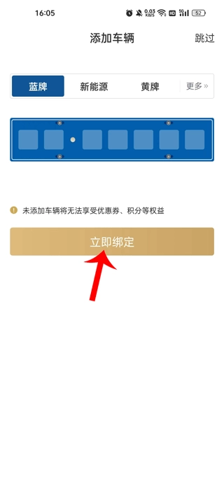 3、接着点击车牌类型,再点击输入车牌处,最后点击立即绑定。