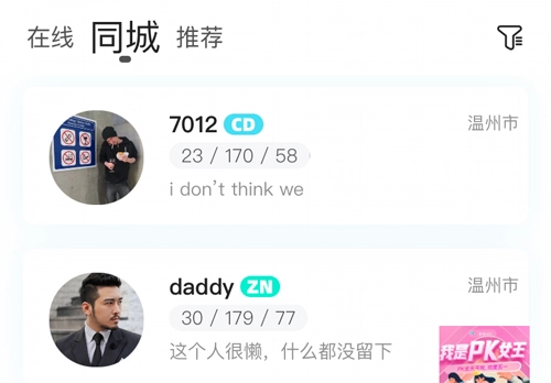 你们在打开喜弟之后,就可以看到最下面的一行有一个【交友】,然后你们就可以看到中间的位置有一个内容是【在线】、【同城】、【推荐】。这个时候你们就点击【同城】就可以了。在这里向你们展现的就是所有跟你们同城的用户了。