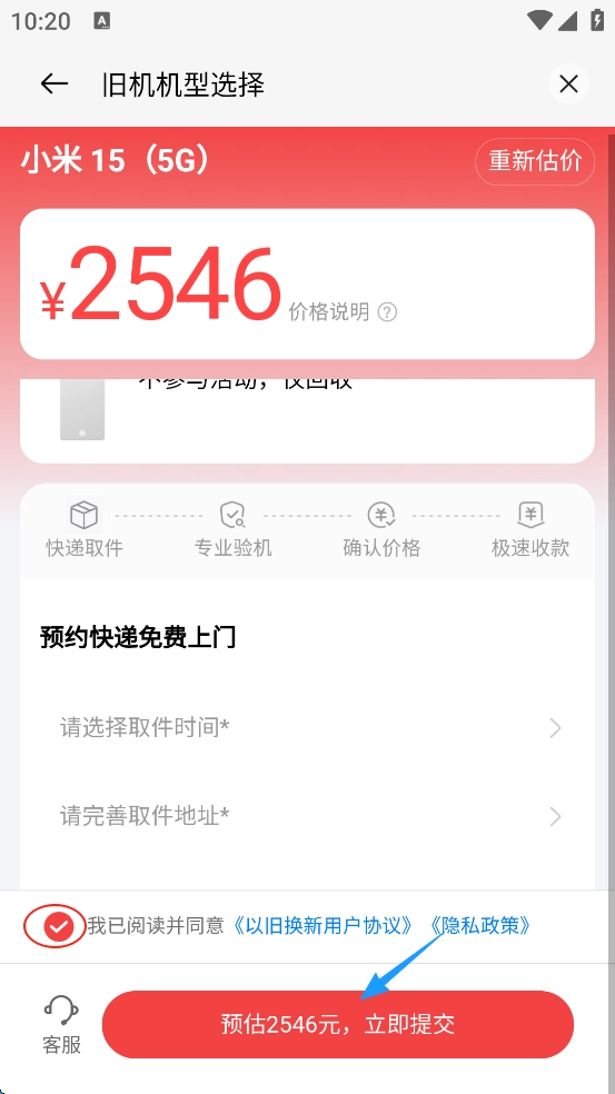 7、挑选预约上门的时间以及上门地址,勾选“我已阅读...”,接着点击“提交”。