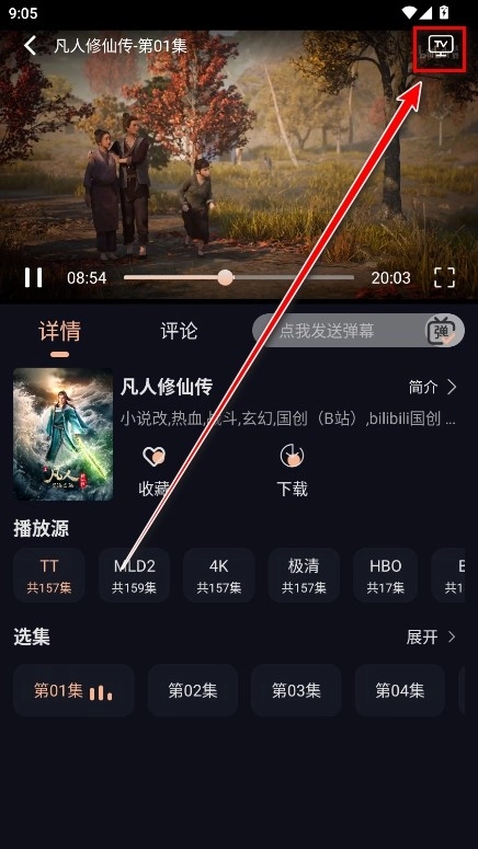 3.点击选中的影视剧进入播放界面,点击右上角的TV按钮,将开始搜索可投屏的设备