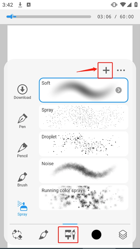 3、进入画板界面后,点击中间的画笔图标,接着点击右上角的“+”号按钮。