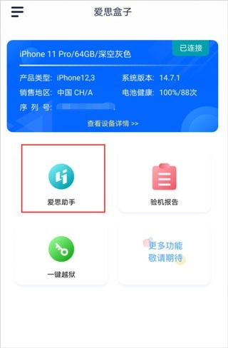 4、当连接成功,“爱思盒子”应用界面会显示“已连接”,此时就能开始体验各项功能。