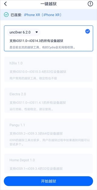 若存在当前 iPhone 适用的越狱工具,其会于应用界面自动呈现。勾选该工具后,点击“开始越狱”,接着耐心等候越狱工具完成安装。安装结束,就能在 iPhone 上开启越狱工具并运行。
