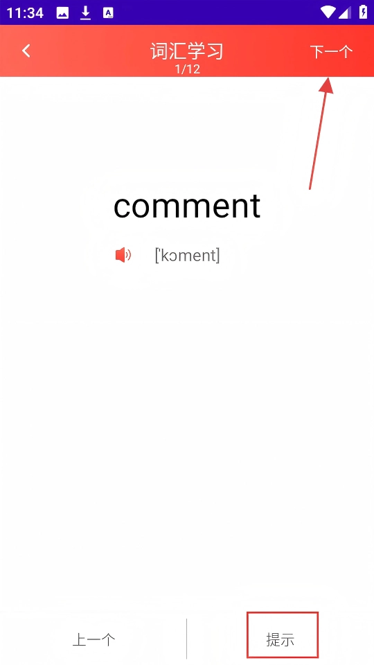 4、学习单词【comment】后,点击右上角的【下一个】,接着学习下一个词汇。