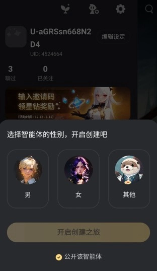 3、挑选智能体的性别,然后开启创建。