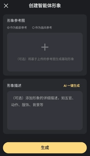 3、上传智能体形象,随后点击【生成】按钮即可。