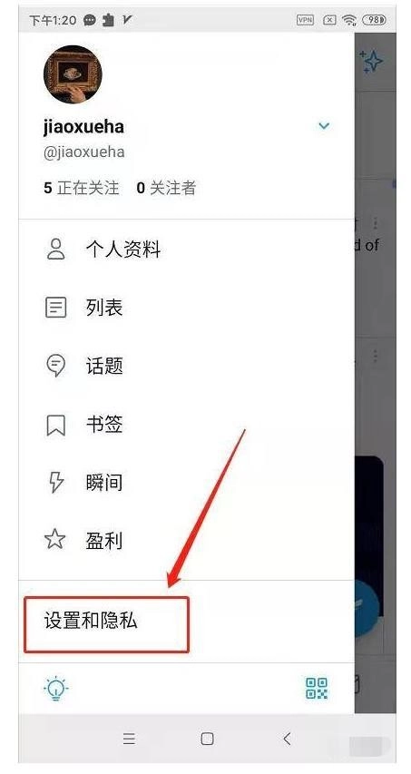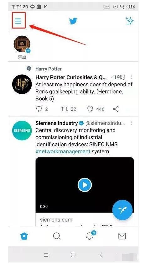 点开Twitter应用,在主菜单里轻点左上角的三条横线,随即会弹出个人菜单的列表。