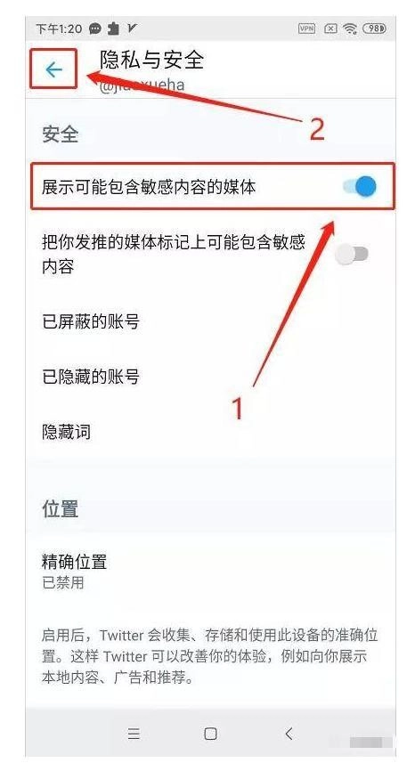 (4) 轻点开启【展示可能包含敏感内容的媒体】选项,随后点击【返回】以保存相关设置。