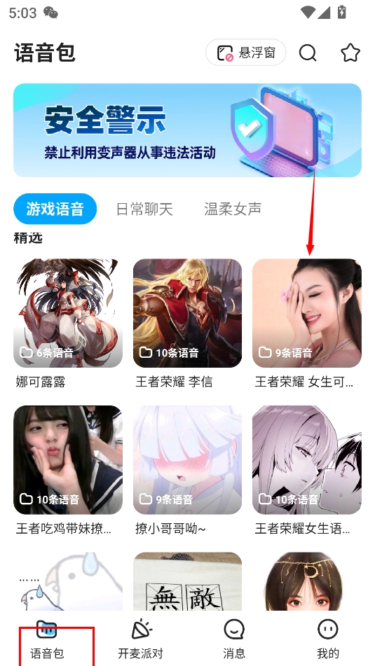 1、在语音包界面挑选一款自己心仪的语音。
